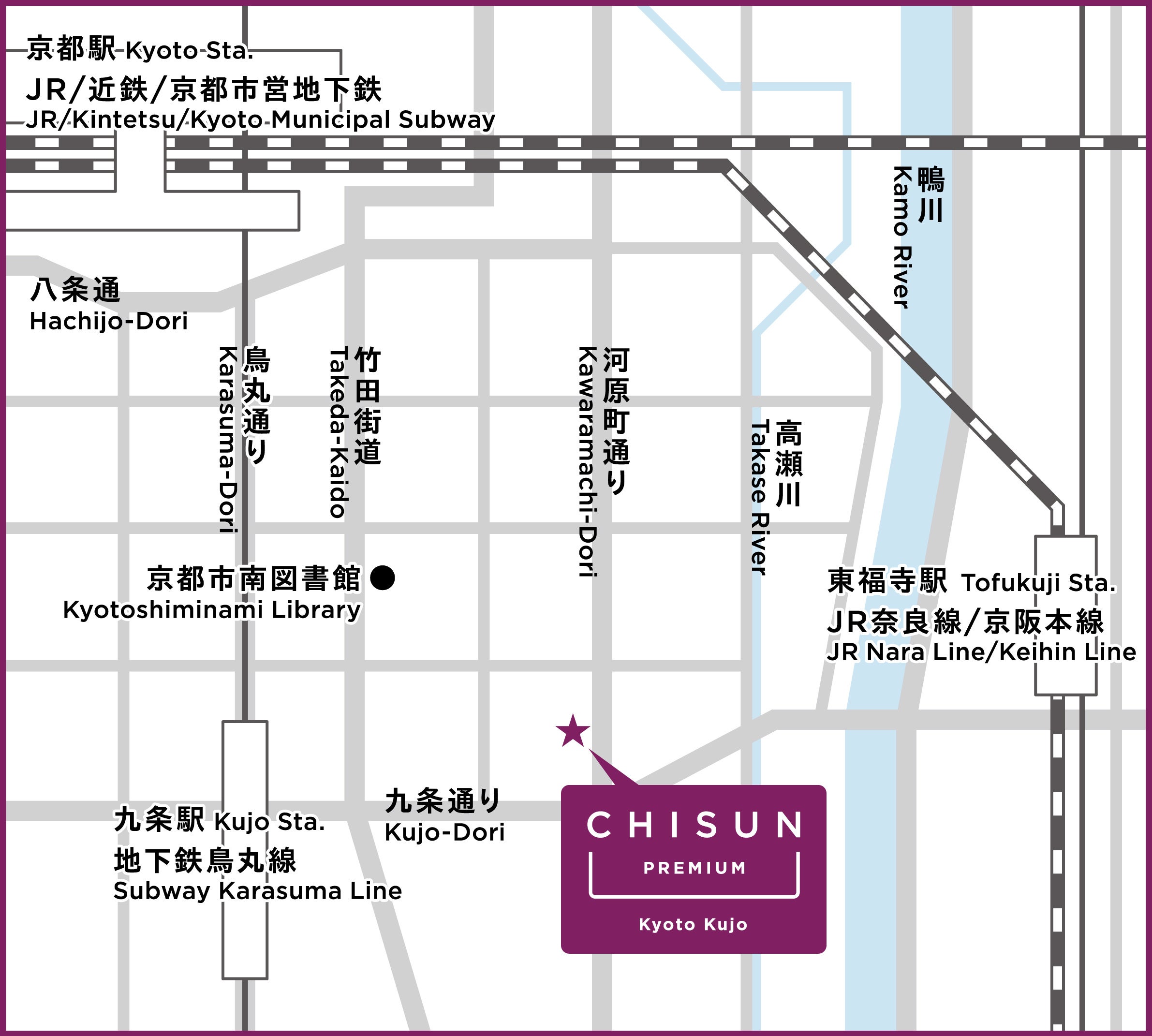 『チサン プレミアム 京都九条』はJR各線・近鉄・市営地下鉄烏丸線「京都駅」八条東口より徒歩8分、地下鉄烏丸線「九条駅」より徒歩6分、JR ・京阪電車「東福寺駅」より徒歩10分に位置します。清水寺や祇園などへも京都市営バス1本で行くことができるアクセスが良い立地のため、観光の拠点として便利なホテルです。